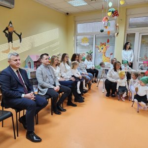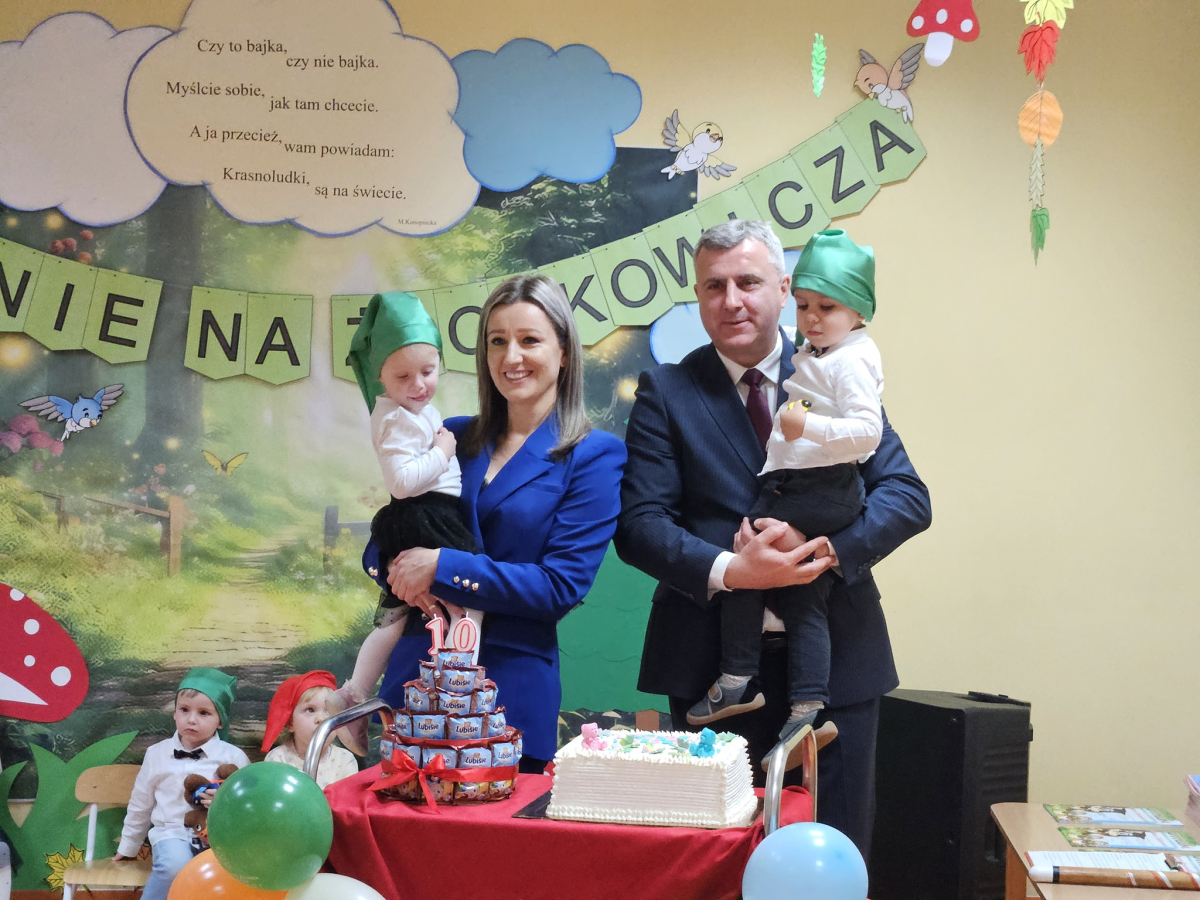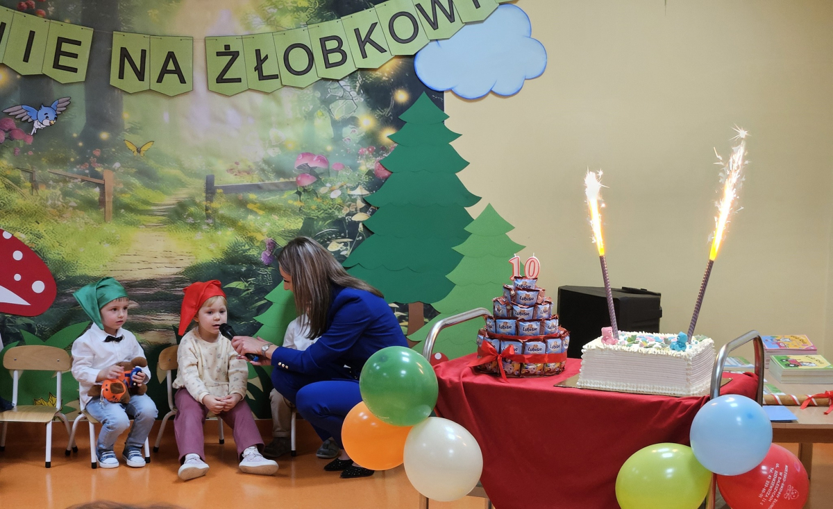 Obchody jubileuszu 10-lecia były okazją do podsumowań i wspomnień. Od dekady tworzymy miejsce pełne ciepła, bezpieczeństwa i troski, w którym dzieci mogą rozwijać swoje umiejętności, budować relacje i poznawać świat poprzez zabawę. Każdy rok to setki małych kroków, pierwszych słów, pierwszych przyjaźni i codziennych sukcesów, które wspólnie przeżywamy. Podczas uroczystości nie zabrakło serdecznych życzeń, podziękowań oraz niespodzianek dla dzieci. Na wszystkich czekał jubileuszowy tort , a najmłodsi otrzymali drobne upominki. Szczególne podziękowania kierujemy do Pana Burmistrza za obecność, ciepłe słowa oraz okazane wsparcie i życzliwość wobec naszej placówki. Dziękujemy za pamięć o najmłodszych mieszkańcach oraz za wspólne świętowanie tak ważnego dla nas jubileuszu. Wyrazy wdzięczności składamy również wszystkim zgromadzonym Gościom za przybycie, miłą atmosferę oraz wspólne przeżywanie tych wyjątkowych chwil. Przed nami kolejne lata pełne wyzwań, uśmiechów i wspólnych sukcesów. Dziękujemy, że jesteście z nami.